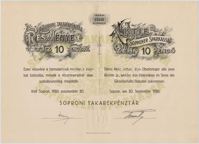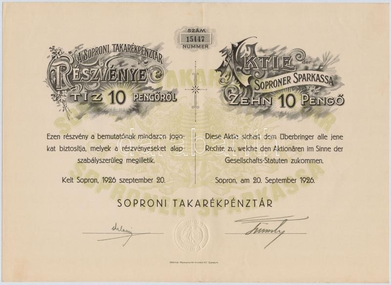 Sopron 1926. "Soproni Takarékpénztár" részvénye 10P-ről, mag... https://www.darabanth.com/de/319-Fernauktion/319.0/Numismatik/Aktien-und-Tickets~2000005/Sopron-1926-Soproni-Takarekpenztar-reszvenye-10P-rol-magyar-es-nemet-nyelvu-szarazpec~II1754293
