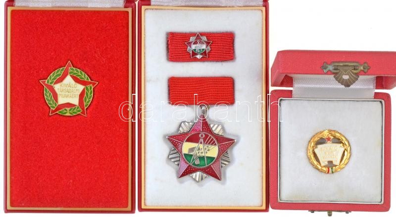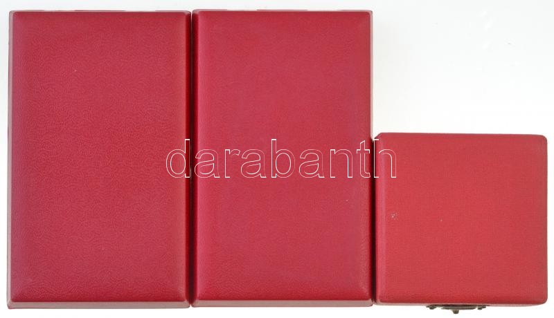 Beschreibung: ~1970. "Szakszervezetek Országos Tanácsa" ezüst fokozatának kitüntetése, szalagsávon, miniatűrrel, eredeti dísztokban + "Kiváló Társadalmi Munkáért" zománcozott, aranyozott jelvény tokban + "Kiváló Népi Ellenőr" aranyozott, zománcozott jelvény (29mm) T:1-,2