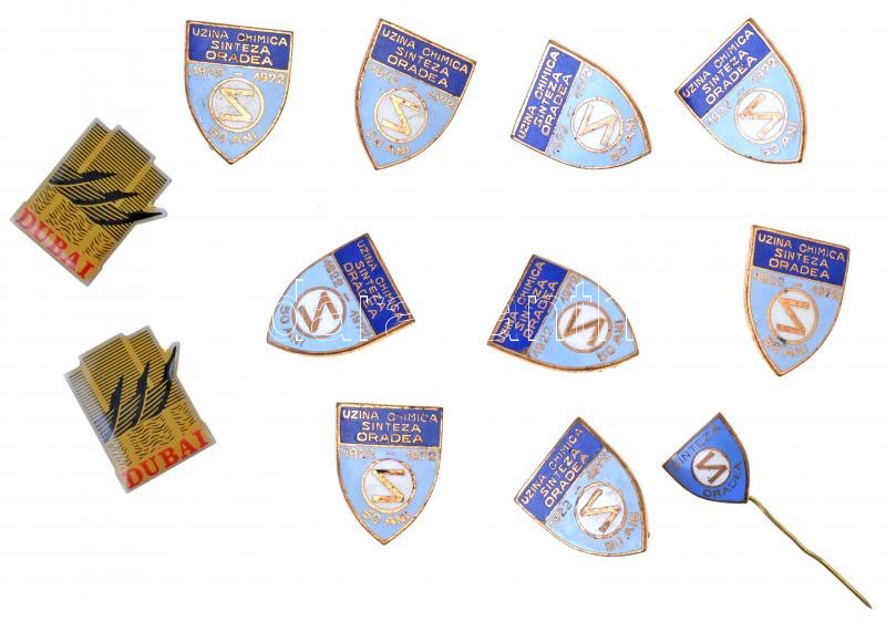 Románia 1972. "Uzina Chimica Sinteza Oradea - 50 ani" 50 éves a nagyváradi kémiai üzem festett jelvény és kitűző (10x) + 2db "Dubai" zománcozott jelvény tű nélkül T:2