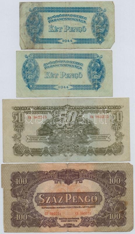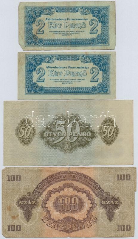 1944. 2P (2x) + 50P + 100P "A Vöröshadsereg Parancsnoksága" ... https://www.darabanth.com/de/319-Fernauktion/319.0/Numismatik/Ungarische-Banknoten~2000007/1944-2P-2x-plus-50P-plus-100P-A-Voroshadsereg-Parancsnoksaga-TIII-III-~II1759259