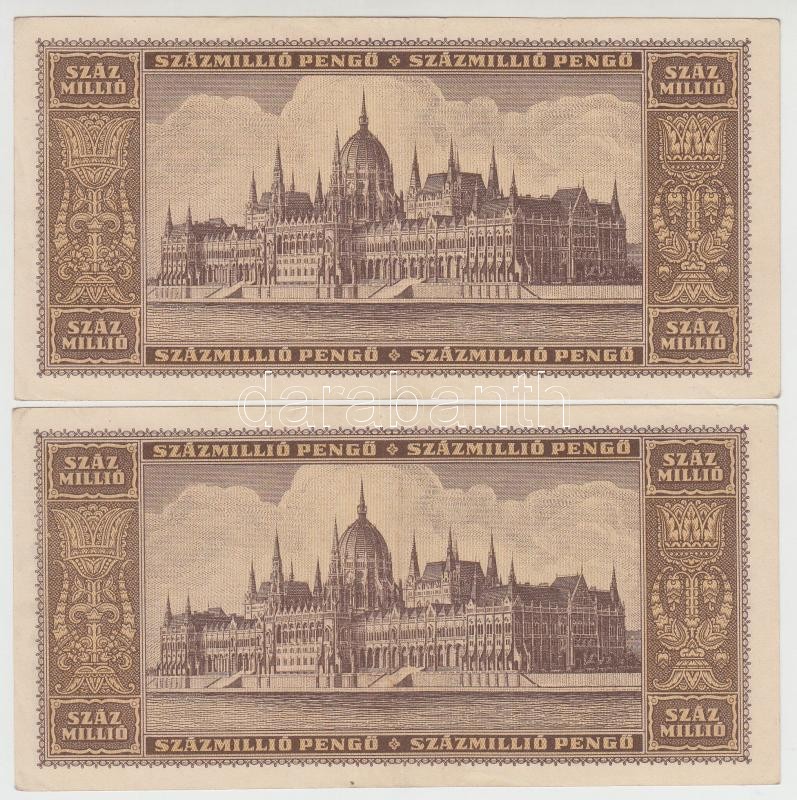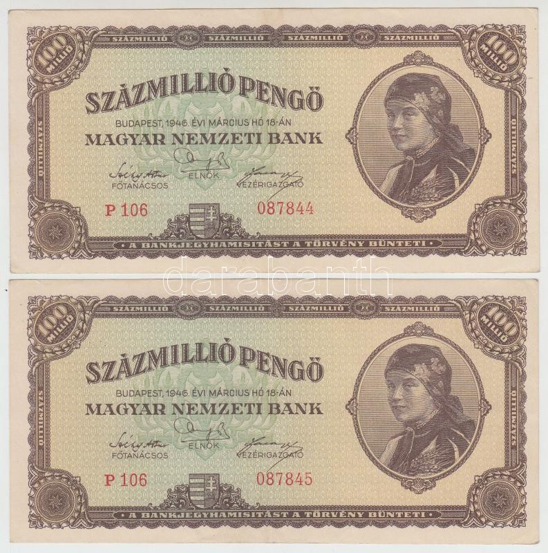 1946. 100.000.000P (2x) sorszámkövetők T:II https://www.darabanth.com/de/319-Fernauktion/319.0/Numismatik/Ungarische-Banknoten~2000007/1946-100000000P-2x-sorszamkovetok-TII~II1756018