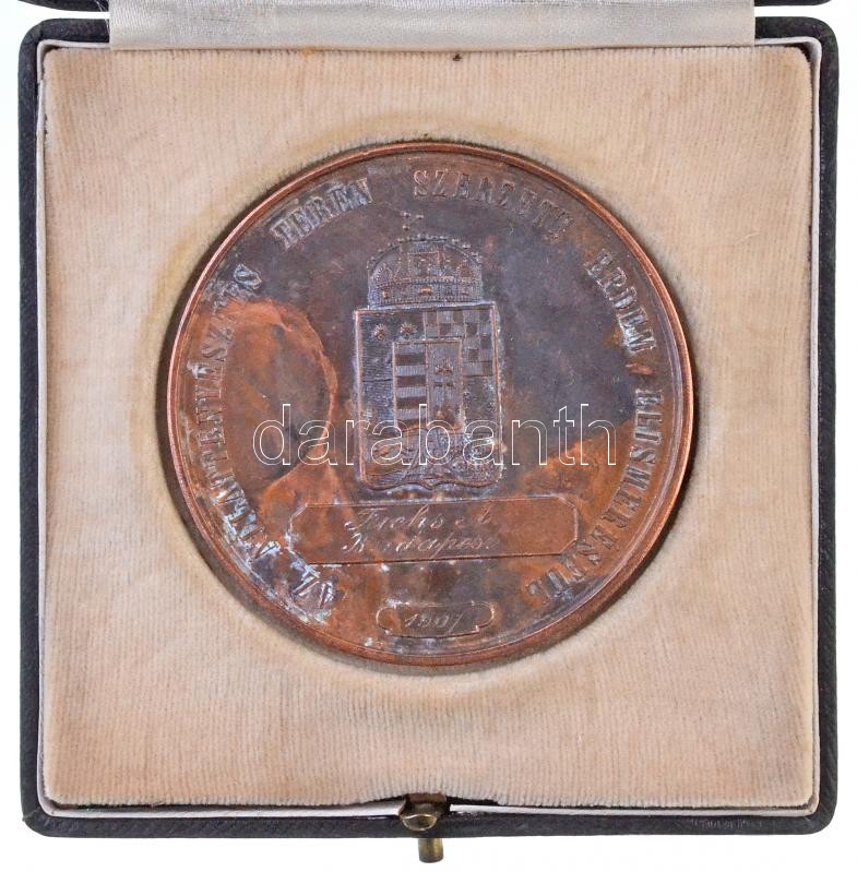 1907. "Ferenc József / Az állattenyésztés terén szerzett érdem elismeréseül" Br díjérem gravírozással a hátoldalán, eredeti dísztokban (62mm) T:2 patina