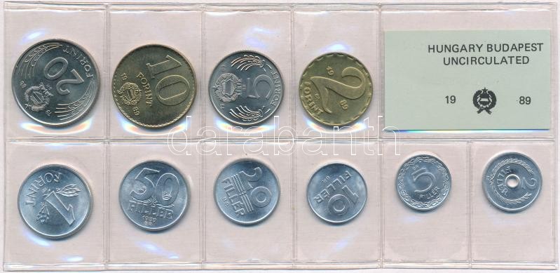 1989. 2f-20Ft (10xklf) érmés forgalmi sor fóliatokban T:1 Adamo FO22 https://www.darabanth.com/de/319-Fernauktion/319.0/Numismatik/Ungarische-Kursmunzsatze~2000010/1989-2f-20Ft-10xklf-ermes-forgalmi-sor-foliatokban-T1-Adamo-FO22~II1762969