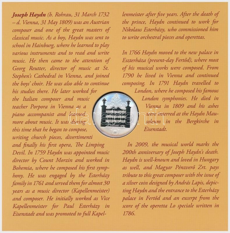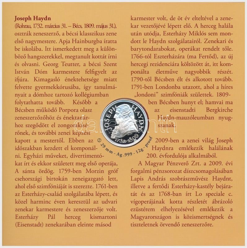 Beschreibung: 2009. 5Ft-200Ft "Haydn" (7xklf) forgalmi érme sor, benne "Joseph Haydn" Ag emlékérem (12g/0.999/29mm) (4x) T:PP