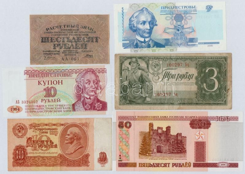 6db-os vegyes külföldi bankjegy tétel, közte Fehéroroszország 2000. 50R, Szovjetunió 1938. 3R, Transznisztria 2000. 5R T:I,III 6pcs of diff banknotes, including Belarus 2000. 50 Rublei, Soviet Union 1938. 3 Rubles, Transnistria 2000. 5 Rublei C:UNC,F
