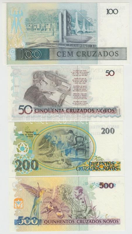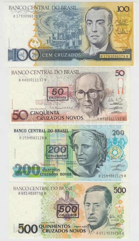 Brazil 1987. 100 Cruzados + 1990. 50 Cruzados with "50 Cruzeiros" overprint + 200 Cruzados with "200 Cruzeiros" overprint + 500 Cruzados with "500 Cruzeiros" overprint C:UNC