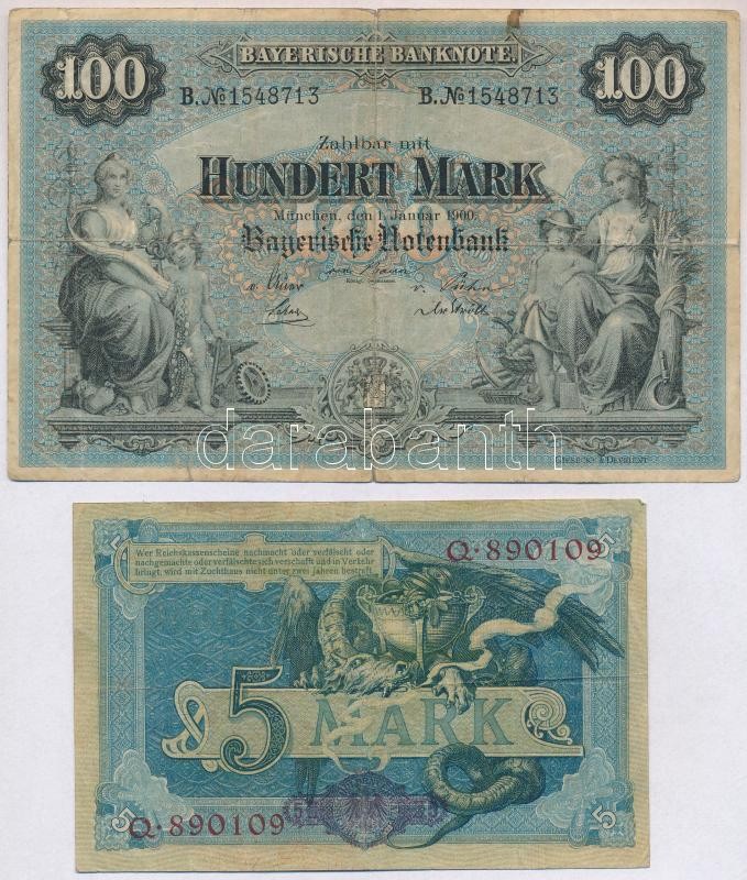 German E... https://www.darabanth.com/de/319-Fernauktion/319.0/Numismatik/Weltweit-Banknoten~2000014/Nemet-Birodalom-1904-5M-plus-Bajororszag-1900-100M-TIII-III---German-Empire-1904-5-Mark-plus-Bavaria~II1758534