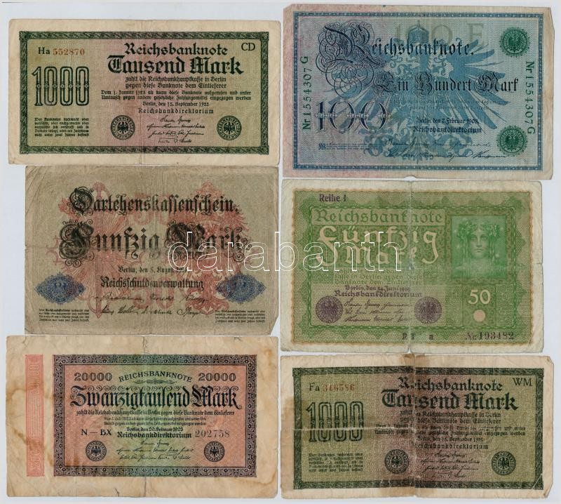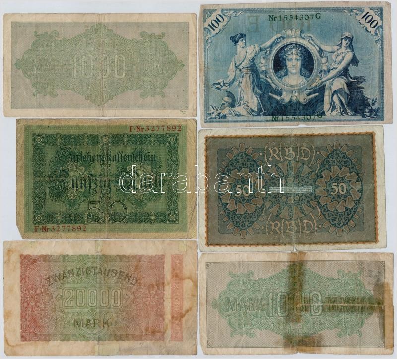 Német Birodalom / Weimari Köztársaság 1908-1923. 6db bankjegy, közte 1908. 100M T:III-,IV közte ragasztott