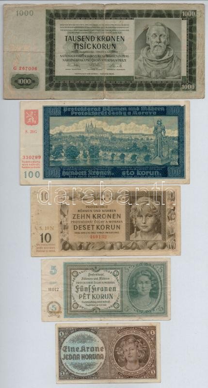 Beschreibung: Német Harmadik Birodalom / Cseh-Morva Protektorátus 1940. 1K + 5K + 100K + 1942. 10K + 1000K T:III,III-