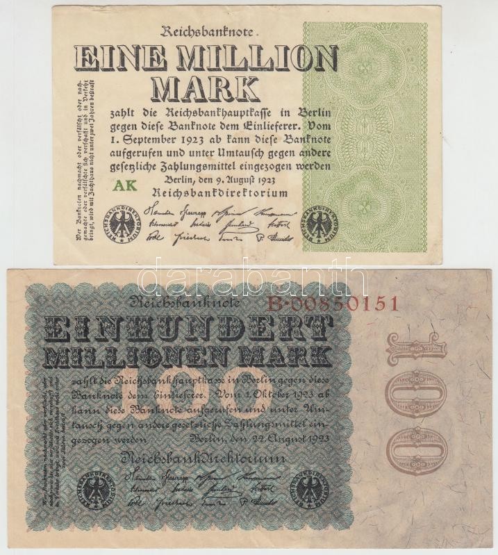 Németország / Weimari Köztársaság 1922. 1000M + 1923. 20.000M + 1.000.... https://www.darabanth.com/de/319-Fernauktion/319.0/Numismatik/Weltweit-Banknoten~2000014/Nemetorszag-Weimari-Koztarsasag-1922-1000M-plus-1923-20000M-plus-1000000M-plus-100000000M-TIII~II1762311