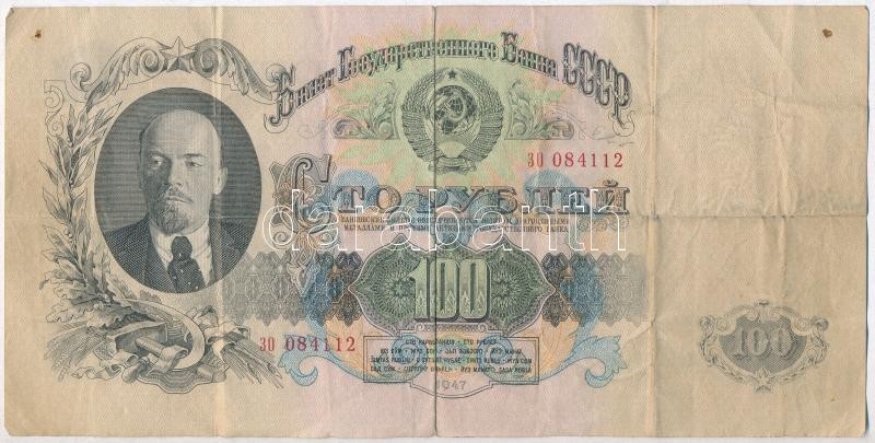 Soviet Union 1947. 100 Rubles ... https://www.darabanth.com/de/319-Fernauktion/319.0/Numismatik/Weltweit-Banknoten~2000014/Szovjetunio-1947-100R-TIII-apro-ly--Soviet-Union-1947-100-Rubles-CVG-small-hole~II1745034