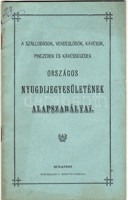 Beschreibung: Szállodások, vendéglősök, kávésok, pinczérek és kávéssegédek orsz. nyugdíjintézetének alapszabályai