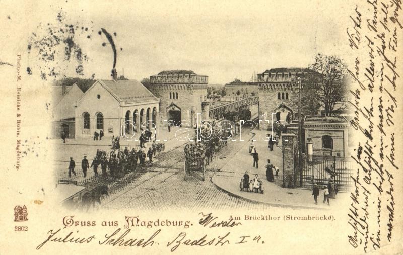 1898 Magdeburg, Am Brückthor (Strombrücke) / timber transport on the b... https://www.darabanth.com/de/32-Gross-Auktion/32.1/Ansichtskarten/Deutschland~13772/1898-Magdeburg-Am-Bruckthor-Strombrucke-timber-transport-on-the-bridge-by-horse-carts-soldie~II2035956