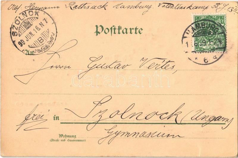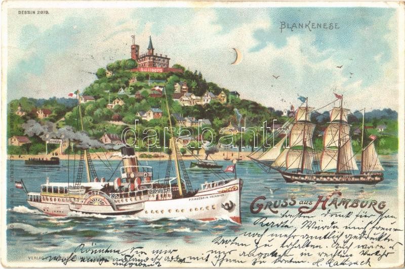 Beschreibung: 1899 Hamburg, Blankensee, Süllberg / lake, SS Prinzessin Heinrich. W. Hagelberg Dessin 2979. Emb. hold to light litho