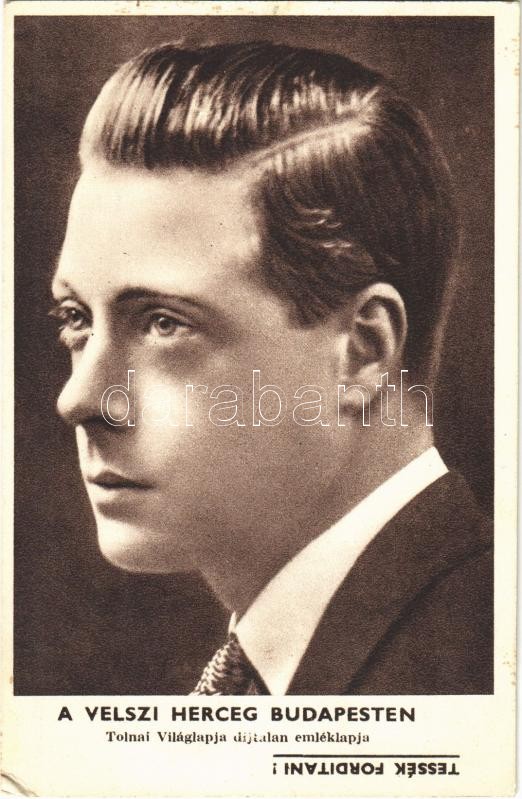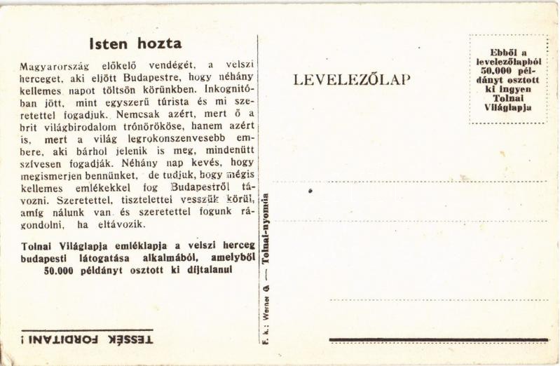 A velszi herceg Budapesten. A Tolnai Világlapja díjtalan emléklapja / Edward VIII, Prince of Wales visiting Budapest (EK)