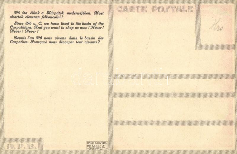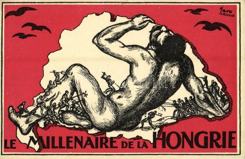 Le Millenaire de la Hongrie. 896 óta élünk a Kárpátok medencéjében. Most akartok elevenen felkoncolni? Kiadja az Országos Propaganda Bizottság / Hungarian irredenta art postcard s: Gara Arnold