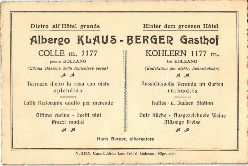 Beschreibung: Colle, Kohlern (Bolzano, Bozen); Südtirol, Klaus Berger Gasthof / Albergo / hotel. Advertisement on the backside