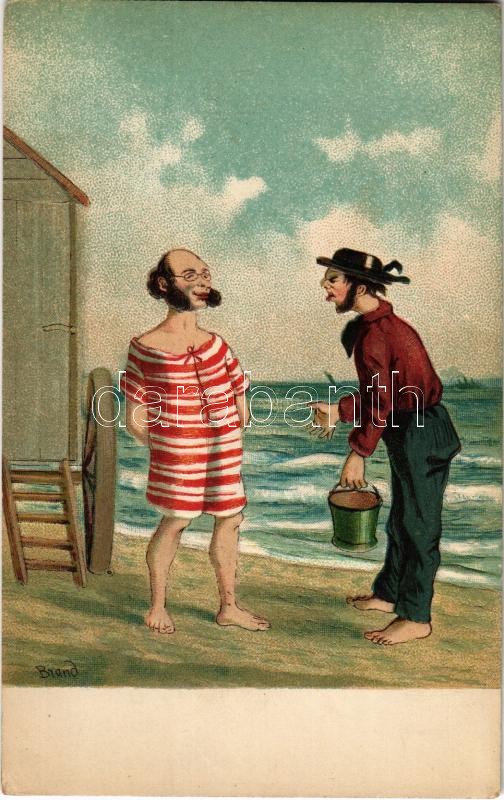 Beschreibung: Dombornyomott antiszemita művészlap. Zsidó férfiak a strandon / Jewish men on the beach. Anti-Semitic Judaica art postcard. Emb. litho s: Brand