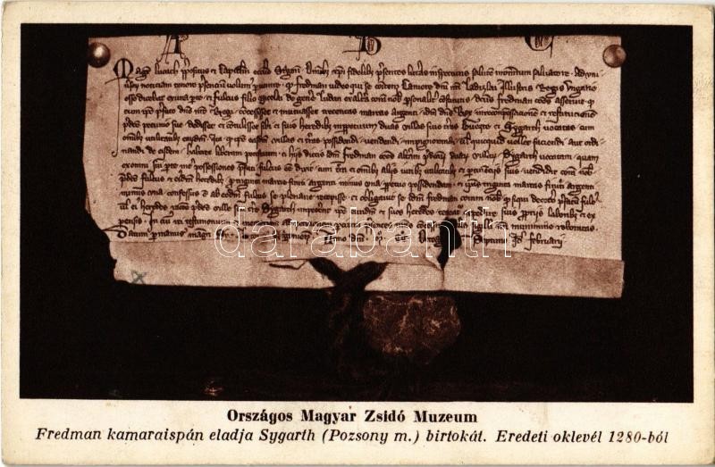 Országos Magyar Zsidó Múzeum. Fredman kamaraispán eladja Sygarth birtokát. Eredeti oklevél 1280-ból / Fredman (master of the treasury) selling Sygarth's mansion, Judaica