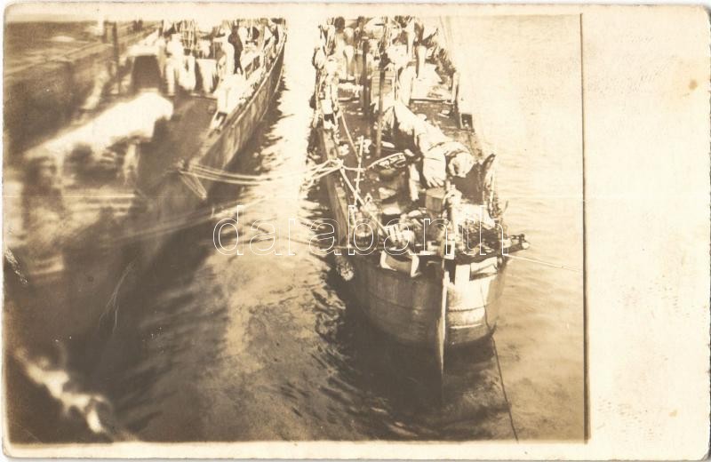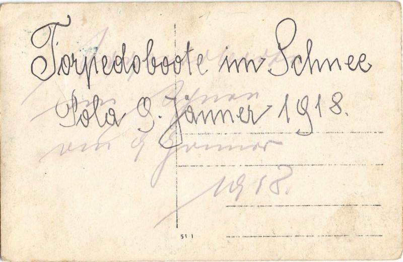 1918 Pola, Pula; Osztrák-magyar haditengerészet torpedónaszádjai hóval borítva a kikötőben télen / K.u.K. Kriegsmarine Torpedoboote im Schnee / Austro-Hungarian Navy torpedo boats covered in snow at the port in winter. photo (EK)