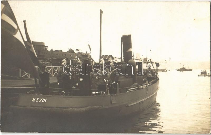 M.T. XIII osztrák-magyar aknakereső (aknászhajó), német főtisztek a fedélzeten / K.u.K. Kriegsmarine Minentender XIII / Austro-Hungarian Navy minesweeper M.T. XIII with German officers and admiral (?) on board. Phot. Alois Beer + "Marineverband, Landesverband für Kärnten in Klagenfurt"