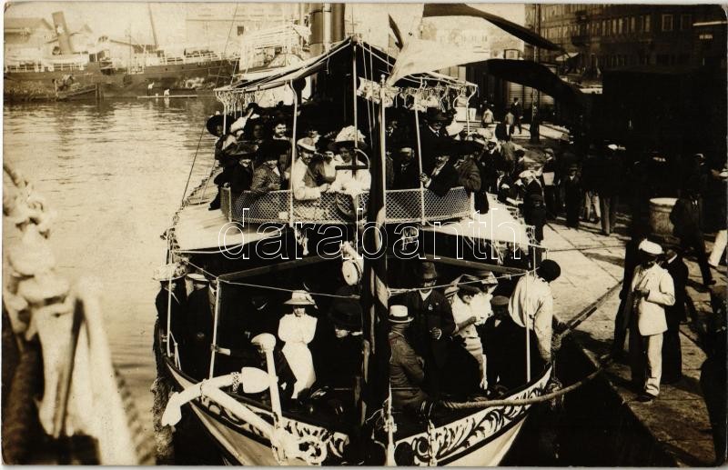 Fiume, Rijeka; Sirály egycsavaros tengeri személyszállító gőzhajó (Salondampfer) a kikötőben, utasok a fedélzeten / Hungarian single screw sea-going passenger steamer at the port, passengers on board. Schäffer Armin photo