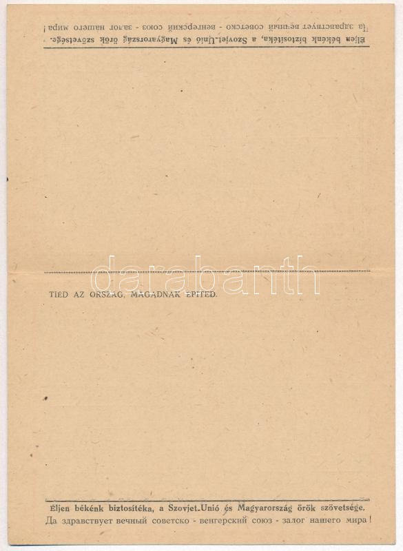 1948 Éljen Rákosi Mátyás, a hadifoglyok hazasegítője. Tiéd az ország, magadnak építed. Éljen békénk biztosítéka, a Szovjet-Unió és Magyarország örök szövetsége. Használatlan orosz-magyar hadifogoly levelezőlap fordított állású párban. Kiadja a Magyar Dolgozók Pártja Központi Hadifogoly Irodája / Unused Russian-Hungarian POW (prisoner of war) postcard in pair issued by the Hungarian Working People's Party