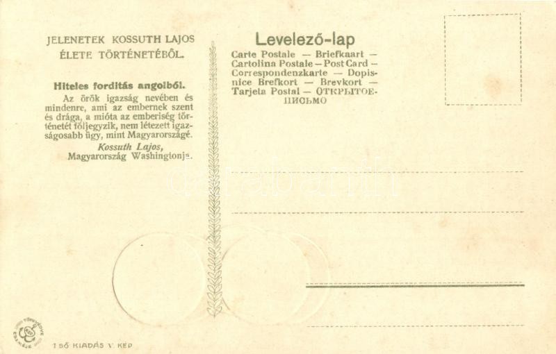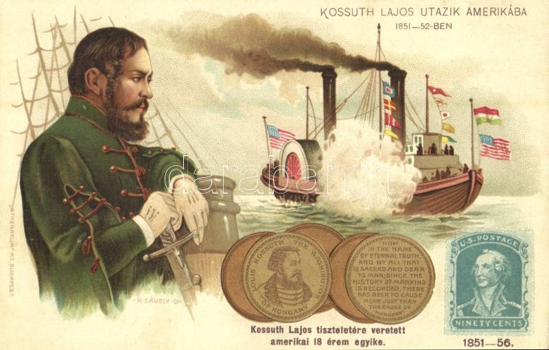 Kossuth Lajos tiszteletére veretett amerikai 18 érem egyike; Kossuth Lajos utazik Amerikába. Jelenetek Kossuth Lajos élete történetéből I. kiadás V. kép. Athenaeum Rt. Budapest / Scenes from the life of Lajos Kossuth. Emb. litho s: K. Sávely D.