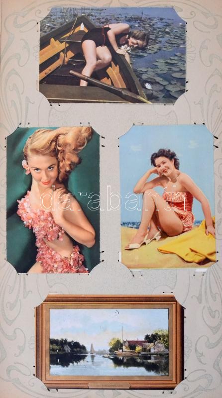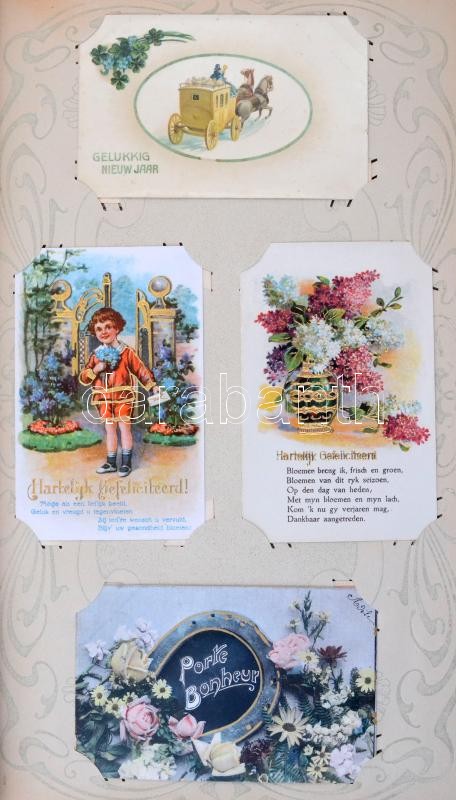Kb. 250 db RÉGI motívum képeslap nagy albumban: litho, állat, üdvözlő, virág. Vegyes minőség / Cca. 250 pre-1950 motive postcards in a big album: litho, animal, flower, greeting. Mixed quality