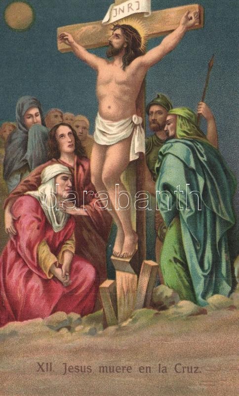 Via Crucis - 14 darabos litho képeslap sorozat Jézus keresztútjáról. Saját tokjában / Litho postcard serie with 14 postcards of Jesus's Stations of the Cross in its own case