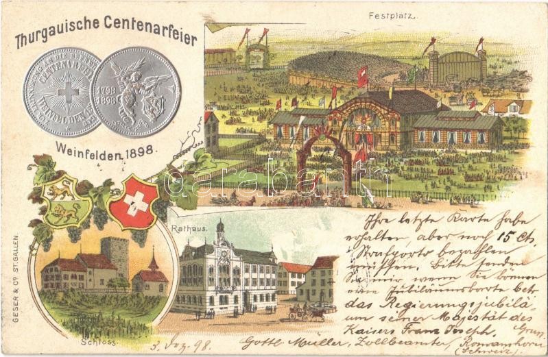 1898 Weinfelden, Thurgauische Centenarfeier, Festplatz, Rathaus, Schloss / Thurgau Centenary celebration, festival place, castle, town hall. Geser & Co. Art Nouveau, floral, litho