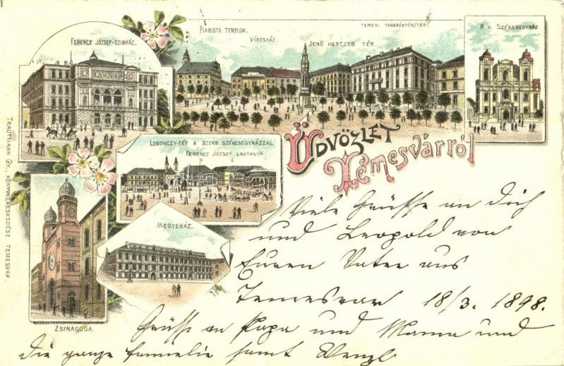 1898 Temesvár, Timisoara; Ferenc József szÃnház, zsinagóga, megyeház, Piarista templom, városház, Losonczy tér, szerb székesegyház, Ferenc József laktanya, JenÅ‘ herceg tér, Temesi Takarékpénztár, Római katolikus székesegyház. Trautmann Gy. kiadása / theatre, synagogue, cathedral, squares, town and county halls, savings bank, military barracks. Art Nouveau, floral, litho (EK)