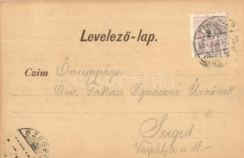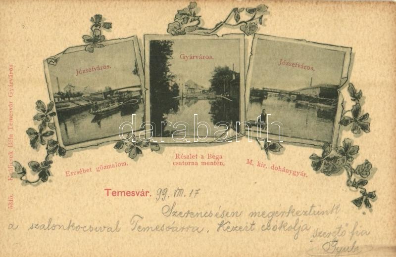 1899 Temesvár, Timisoara; Józsefváros, Gyárváros, Erzsébet gőzmalom, Bega csatorna mente, M. kir. dohánygyár. Králicsek Béla kiadása / Iosefin, Fabrica, Bega river canal, mill, tobacco factory. floral