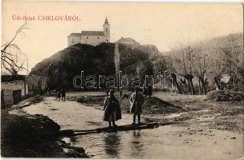 Csiklófalu, Csiklovár, Ciclova; utcakép esőzések után pallókkal, Római katolikus kolostor. Weisz Félix kiadása / street view after rains with footbridges and cloister