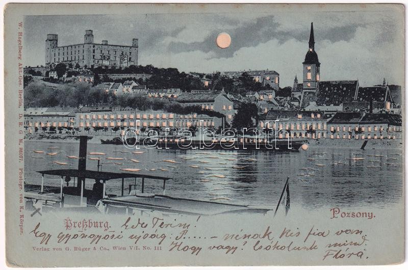 1899 Pozsony, Pressburg, Bratislava; Duna és vár, este. Világosság felé tartandó.W. Hagelberg, photogr. K. Körper / Danube and castle, night. Hold to light litho