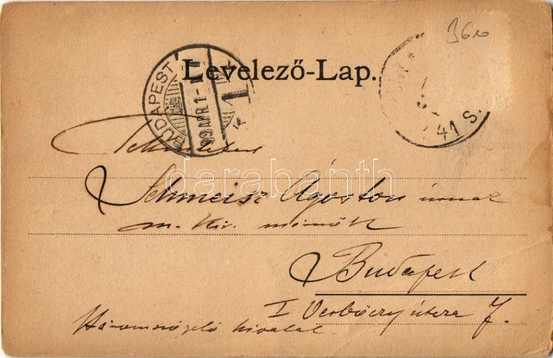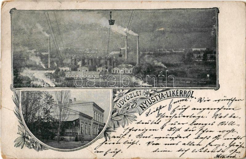 Beschreibung: 1899 (Vorläufer!) Nyustya-Likér, Hnústa-Likier; vasgyár, vasútállomás / iron works, railway station. Art Nouveau, floral (EK)