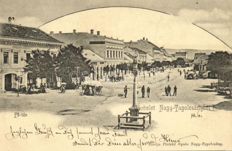 Beschreibung: 1903 Nagytapolcsány, Topolcany; Fő tér, szobor, üzletek, piac. Platzkó Gyula kiadása / main square, shops, market (kicsit ázott / small wet damage)