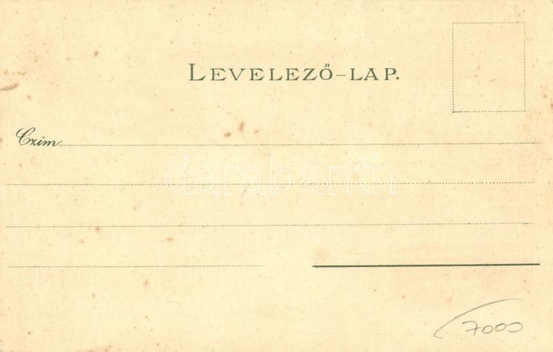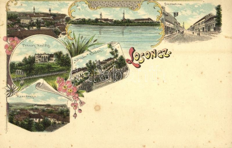 Losonc, Lucenec; Prónay kastély, Kaszárnya, Kármán emlék, Gácsi (Gáesi) utca / castle, military barracks, monument, street. Art Nouveau, floral, litho (szakadás / tear)