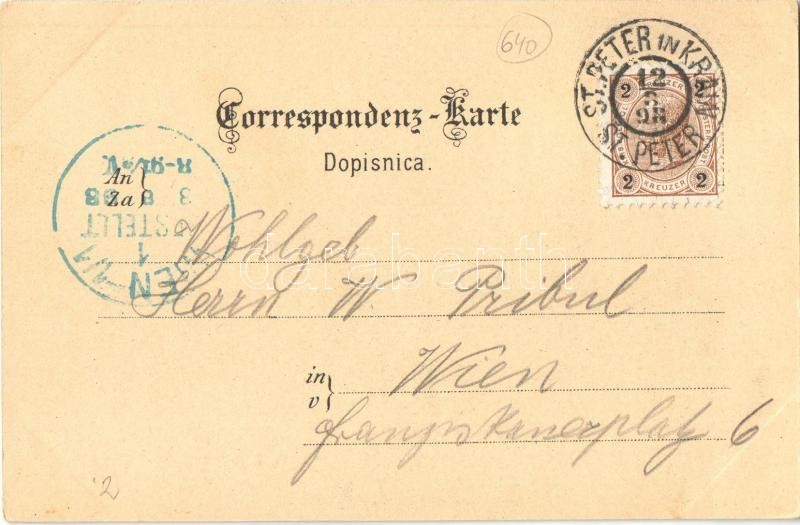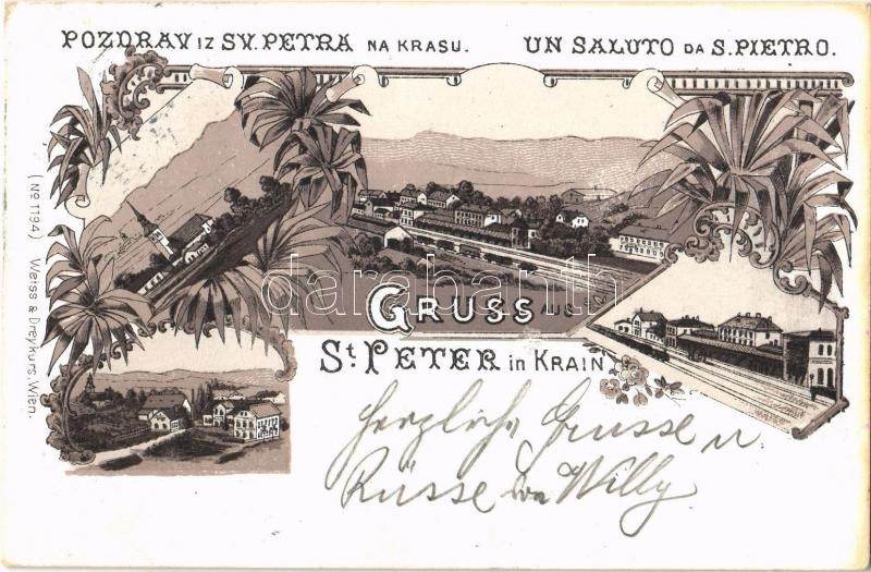 1898 Pivka, St. Petra na Krasu, San Pietro del Carso, St. Peter in Krain; railway station, church. Weiss & Dreykurs No. 1194. Art Nouveau, floral, litho (EK)