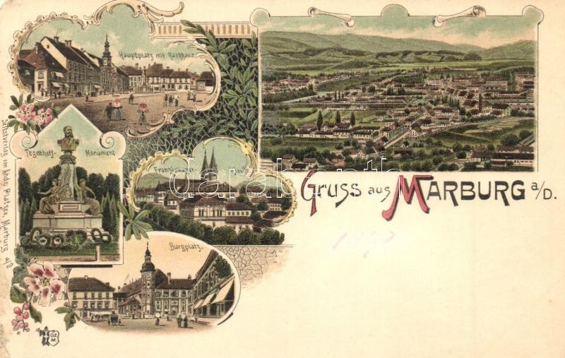 Maribor, Marburg a. Drau; Hauptplatz, Rathaus, Tegethoff Monument, Franziskaner Kirche, Burgplatz / main square, town hall, monument, church. Selbstverlag von Andr. Platzer, floral, Art Nouveau, litho (EK)