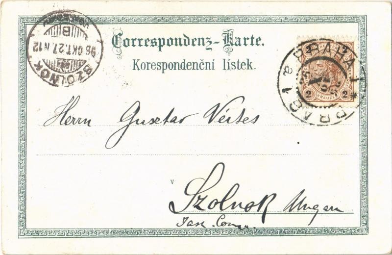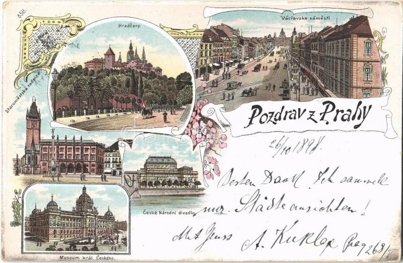 1898 Praha, Prag, Prague; Hradcany, Václavske námesti, Museum Král. Ceského, Staromestská radnice, Ceské Národní divadlo / castle, square, museum, old town hall, theatre. Art Nouveau, floral, litho