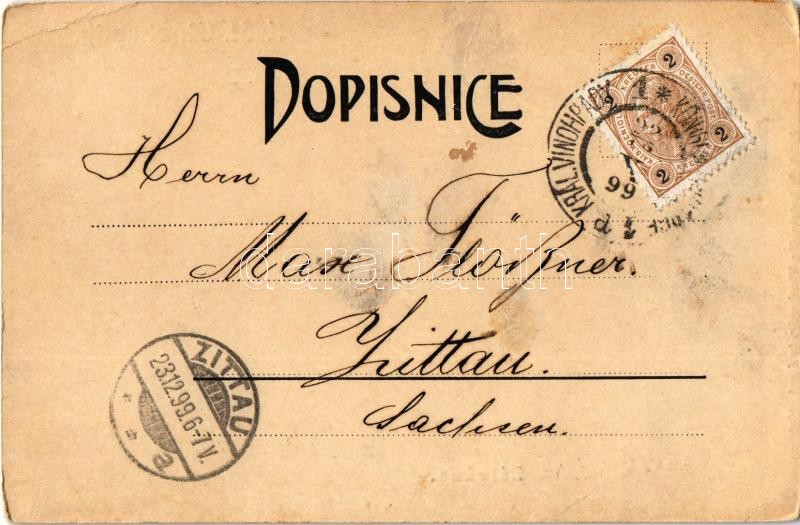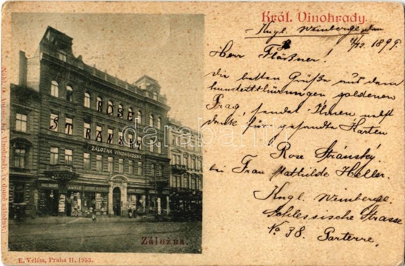 1899 (Vorläufer!) Praha, Prag, Prague; Královské Vinohrady, Zálozna Vinohradská / credit union, shops of Karell Oralsky, Antos, Josef Mandl and Josef Wintera (EK)