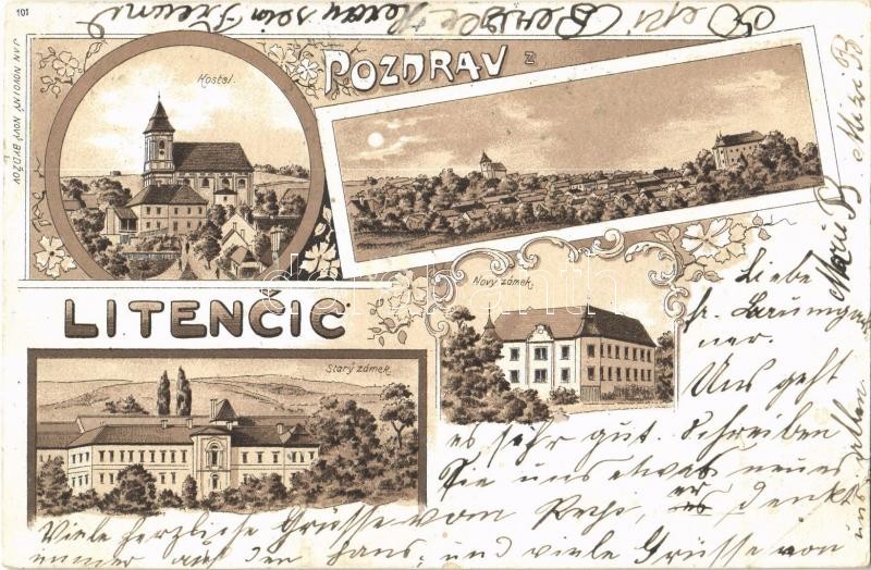 Beschreibung: Litencice, Kostel, Stary zamek, Novy zámek / church, old and new castles. Jan Novotny Art Nouvea, floral, litho (EK)