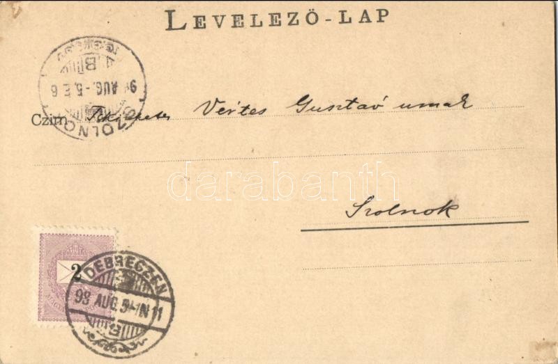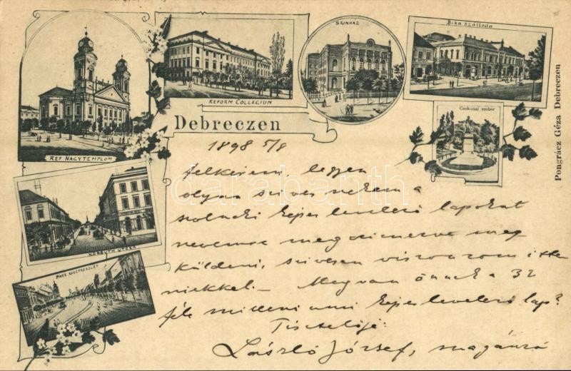 1898 (Vorläufer!) Debrecen, Református nagytemplom és kollégium, szÃnház, Bika szálloda, Csokonai szobor, Kossuth utca, Piac középrészlet, Lichtenstein József üzlete. Pongrácz Géza kiadása. Art Nouveau, floral