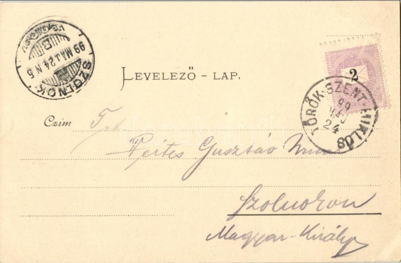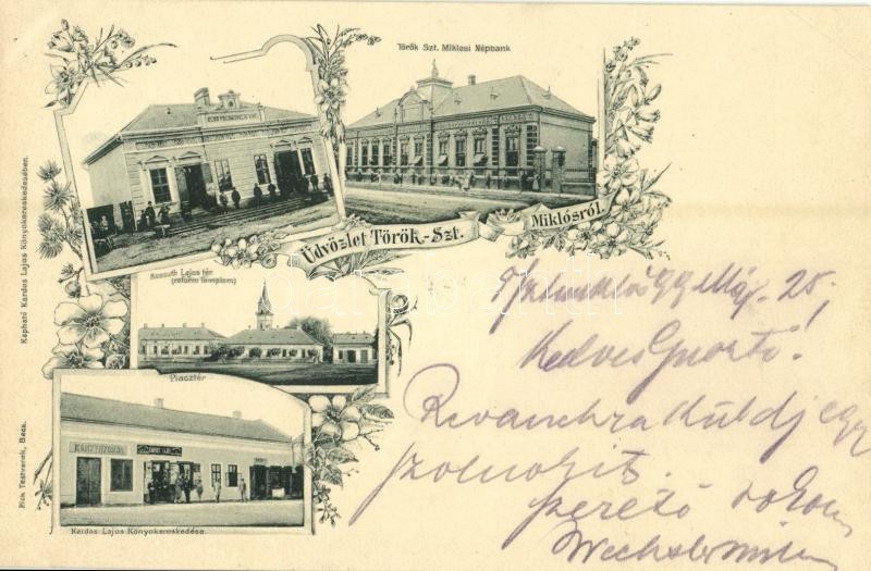 1899 (Vorläufer!) Törökszentmiklós, Népbank, Első Földművelői Kör, Piactér, Református templom, Könyvnyomda, Kossuth Lajos tér, Kardos Lajos Könyvkereskedése és saját kiadása. Art Nouveau, floral