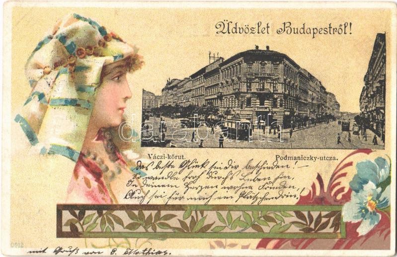 Beschreibung: 1900 Budapest VI. Váci körút (Bajcsy Zsilinszky út) és Podmaniczky utca, villamosok. Art Nouveau, litho