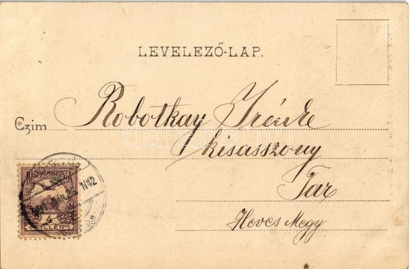 Beschreibung: 1901 Békéscsaba, Békés-Csaba; Vasút utca, Bille Bernát üzlete, Városi színház, Lepage Lajos könyvnyomdája és saját kiadása. Art Nouveau