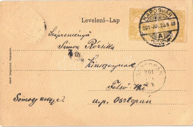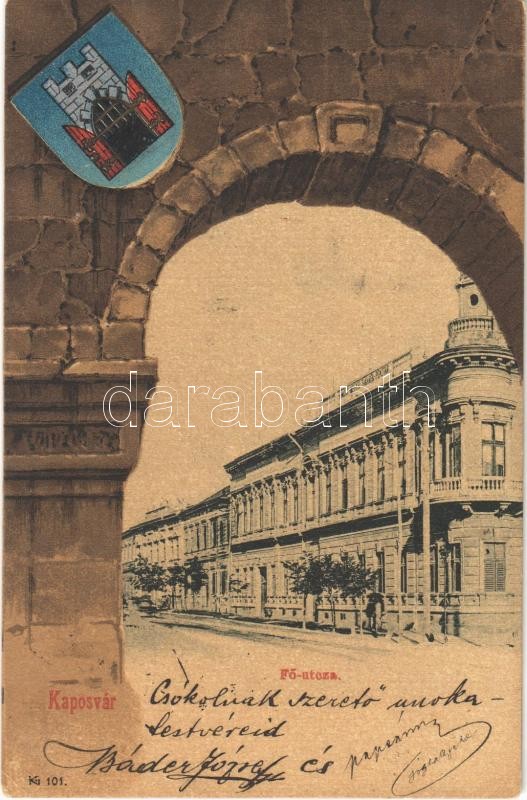 1901 Kaposvár, Fő utca, Somogy-Megyei Takarékpénztár. Címeres szecessz... https://www.darabanth.com/de/32-Gross-Auktion/32.1/Ansichtskarten/Ungarn~13725/1901-Kaposvar-Fo-utca-Somogy-Megyei-Takarekpenztar-Cimeres-szecesszios-keret-Art-Nouveau-~II2043503