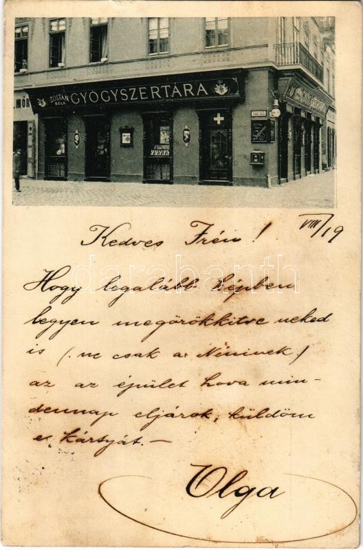 1903 Budapest V. Lipótváros, Zoltán Béla Gyógyszertára. Sétatér utca 1... https://www.darabanth.com/de/32-Gross-Auktion/32.1/Ansichtskarten/Ungarn~13725/1903-Budapest-V-Lipotvaros-Zoltan-Bela-Gyogyszertara-Setater-utca-1-ma-Bank-utca~II2032931