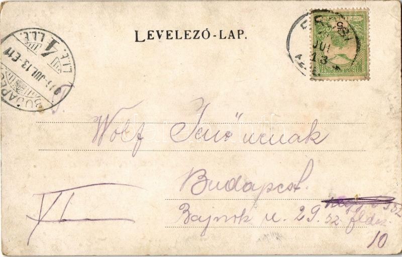 Beschreibung: 1903 Ercsi, Eötvös emlékszobor, Fő utca, este. A. Schwidernoch, Art Nouveau, floral (EK)